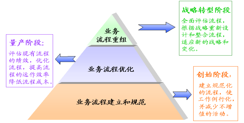 企业在建立初期,主要面临的问题是业务流程的建立和规范,发展中期则主要面临的是流程的优化与完善,随着企业进入成熟期,战略面临重新设计与变革,流程方面面临的问题也就不仅仅是小的偏差和效率问题,而是影响企业生存和发展的本质性偏差,例如: