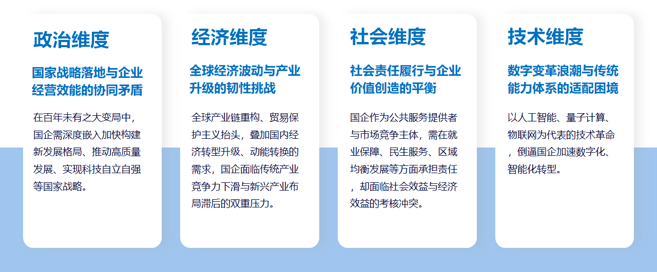 2025年开启的十五五时期,是我国全面建设社会主义现代化国家的关键阶段,也是国企深化改革、重塑竞争优势的战略窗口期。国企作为国民经济的压舱石与国家战略的执行者,既承载着巩固公有制经济主体地位、服务国家重大战略的政治使命,又需在全球经济格局深度调整、科技革命加速演进、社会治理复杂化的背景下,破解多重维度的核心矛盾,实现政治属性与市场属性的有机统一。