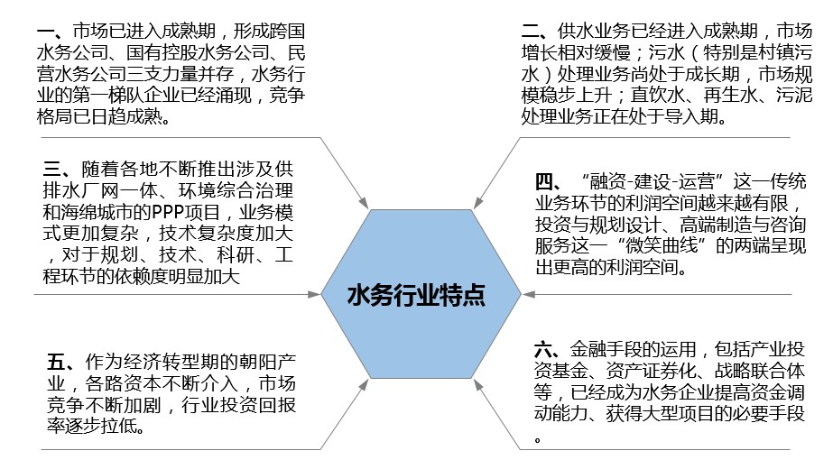 以北控水务、首创股份、碧水源为代表的企业一马当先,各地方水务水利集团与水务上市公司(中山公用、国祯环保、兴蓉环境、重庆水务等)、环境投资公司、具有工程优势和资金实力的中央企业、园林绿化企业也纷纷杀入其中。市场呈现如下六个方面的典型趋势: