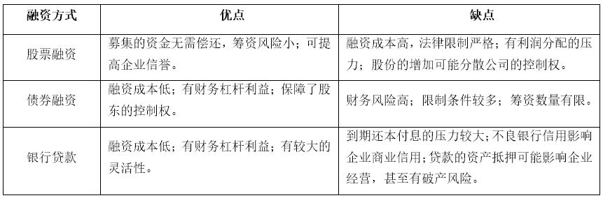 资本筹措战略也称融资战略,即根据企业的经营资金需求和特定的融资环境进行分析,确定最佳的融资规模、资本结构和融资方式的财务战略。选择有利的融资渠道和方法,可以降低资金成本,提高借入资金使用效率。融资战略方案的选择应在综合考虑融资数额、期限、利率、风险等各种因素的基础上进行,最常见的融资方式有股票融资、债券融资和银行贷款三种。它们的优缺点见下表: