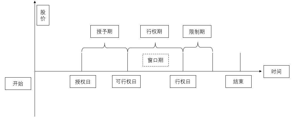 股票期权是一种看涨期权,如图2-2所示示,经营者获得行权权的日期为行权权的授予日,行权权授予日和股票期权到期日之间为行权期;在行权权被授予后,经营者可行使期权购买股票。一般情况下,股票期权是无偿授予的。也有些公司在授予股票期权时计,为了增加对经理人的约束力, 要求经理人支付一定的费用,就是期权费。