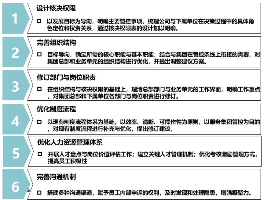 2、组织架构变化之后,集团总部对下属业务单元的管控定位和管控权限尚不明确,对下属单位各条线的管理缺乏具体的工作指引;