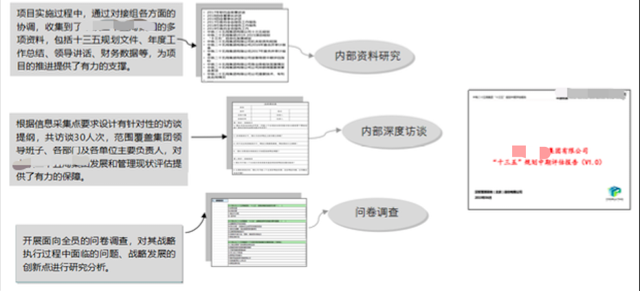 通过资料研究、高层访谈、调查问卷等形式明确十三五战略执行情况。