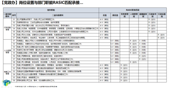 在组织岗位体系设计之初,对标行业内标杆企业以及央地结合的标杆企业,根据该公司实际业务内容,结合对标情况,设计组织架构。并通过价值链分解,分解各部门职责模块,细化各部门职责模块内容,形成部门职责。利用RASIC分析,分解岗位对部门职责的承接,同时结合经验分析法,进行定编分析。