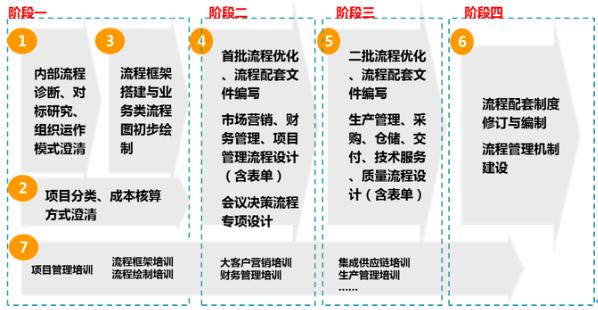 第二阶段:主要为首批流程优化、流程配套文件编写,包含市场营销、财务管理、项目管理流程设计(含表单)、会议决策流程专项设计。