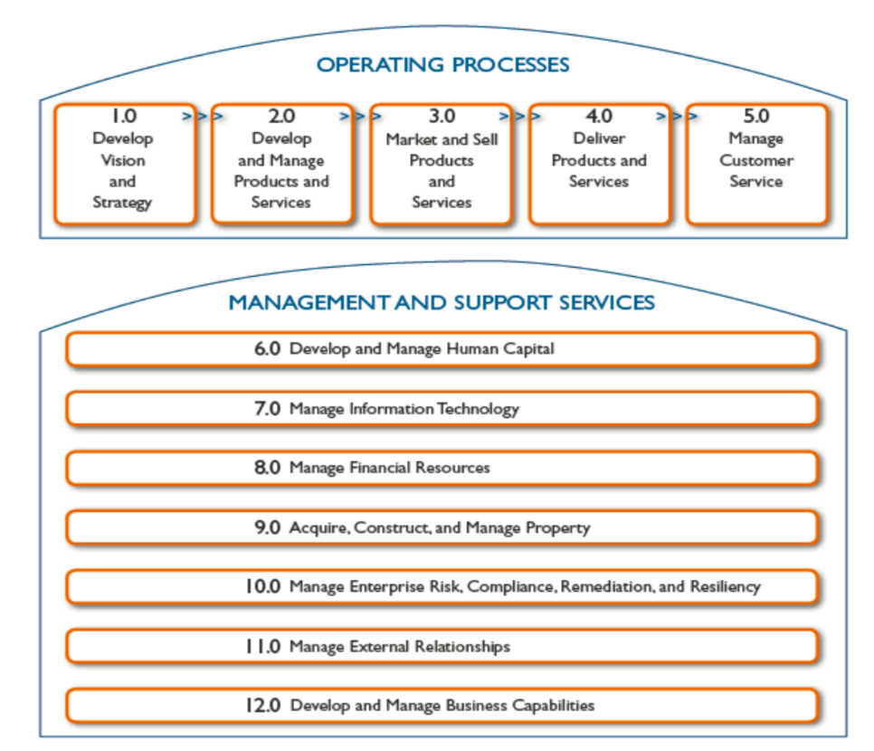 从流程清单架构上,工作组借鉴研究了AQPC(美国生产力与质量中心American Productivity and Quality Center)开发的银行业流程框架(Process Classification Freamwrok,简称PCF),以此为标杆,分析银行当前流程清单架构的完整性、分布合理性。
