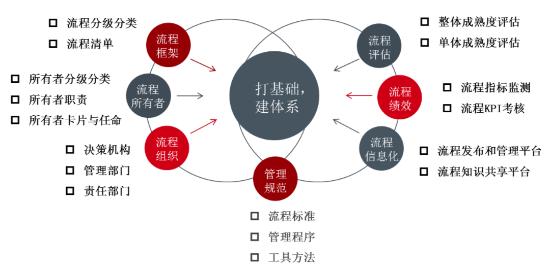 本次项目以“打基础,建体系”为主要目标,为确保形成一套具有可操作性、系统性的流程管理闭环机制,工作组从流程框架、流程所有者、流程组织、流程评估、流程绩效、流程信息化、管理规范七个维度进行银行流程管理的体系搭建和规则设计。