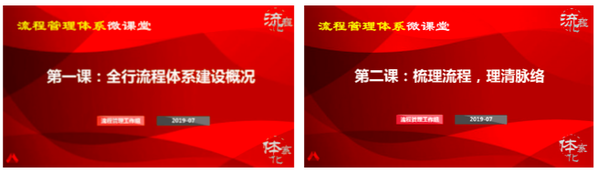 工作组在方案设计的同时,同步开展了系列流程管理知识小手册宣传、流程管理方法工具培训、流程工作成果汇报交流、流程体系微课堂等有助于流程氛围营造和知识传播的工作,如在项目调研初期,运营及流程管理部流程处的同事们精心制作了流程知识小手册,发放给被访谈人,共同开发录制了5次系列流程管理微课程。