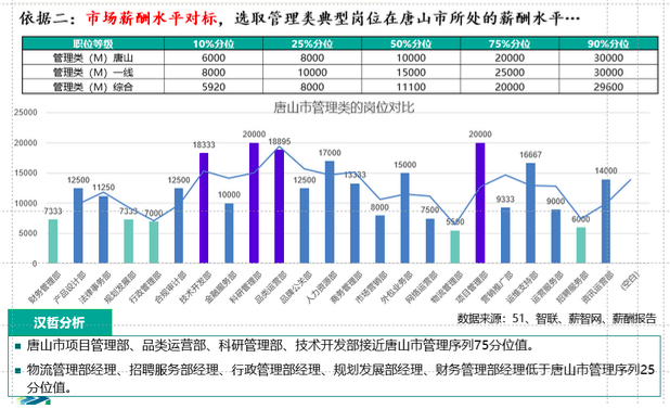 2、对标外部岗位薪酬水平。通过对标北上广等一线城市、唐山市典型岗位各分位值的薪酬水平,运用对标岗位的跟随策略及领先策略,确定各岗位的薪酬水平中位值,确定各岗位的薪酬值,保证公司薪酬水平在市场上有一定的竞争性。