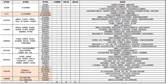 通过对部门职责、部门岗位、人员编制数、现有人数、缺岗人数、岗位职责对组织岗位进行梳理。