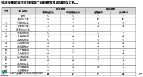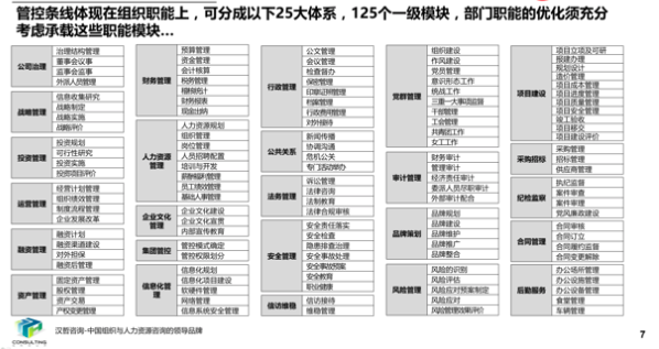在集团组织结构优化与岗位“三定”优化过程中,通过分析集团总部现承载的职能模块并梳理各部门现有职能,结合企业实际需要,对职能模块进行了调整,避免多部门承载同职能模块导致的职能边界不清晰的情况。