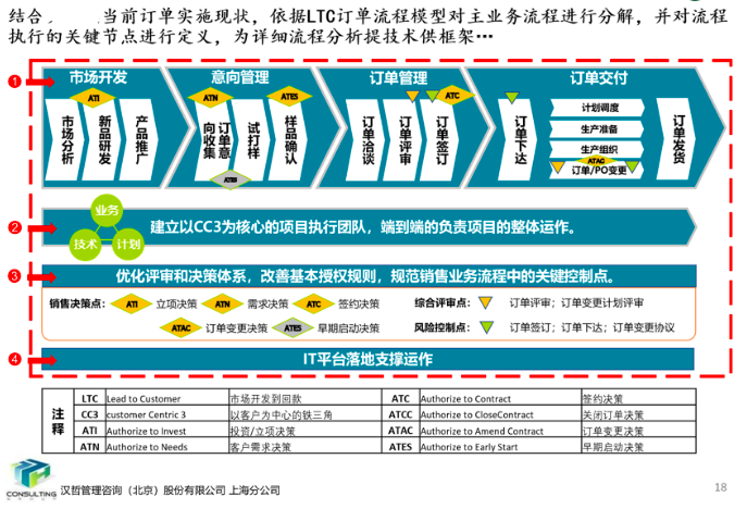 项目组针对公司在生产运营中凸显的问题,应用波特的价值链模型与华为的LTC订单业务模型对公司各项业务活动进行了分析和优化,提出主业务流程框架及业务与支撑流程清单。