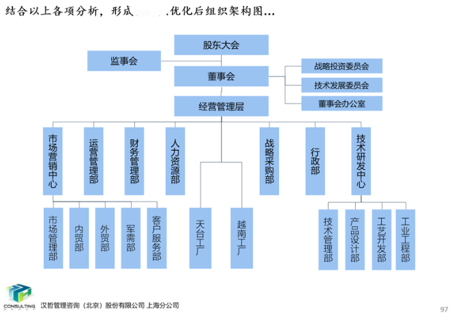 项目组从战略意图、价值链流程、组织功能分析、外部借鉴四个维度对公司的组织体系进行了分析与优化,提出了公司当前的组织架构优化方案以及中长期组织架构优化与调整思路。