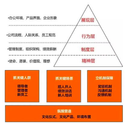 主要的方式有:场景化:文化要落地在公司每一个员工能看到、能感知到场合,比如洗手间、食堂,见缝插针的植入公司文化性和知识性内容,功夫在细节。可视化:把抽象的企业文化和价值观,用漫画、涂鸦等多种形式呈现出来,关键要用员工更易理解和传播的方式加工提炼。可量化:阿里的价值观能落地,不仅仅是阿里有合适的土壤,而在于有可操作的考评工具,采用行为+案例+季度review,每一个价值观的表现评价都是明确的。仪式化:阿里日、年会等节日,公司从上到下大张旗鼓,氛围打造是HR从业者的基本功,从雪中送炭到锦上添花都不能脱节。去总化:公司高层能够俯下身来,像马云经常在内网跟员工回帖,首先要求HR不要刻意去给公司领导造神,学会用互联网思维去影响管理者低下身来。