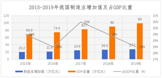 经过数十年的发展,我国制造业不断发展壮大,中国也成为了世界加工制造中心,根据国家统计局数据显示,2019年我国制造业增加值为27.7万亿元,持续占国民生产总值(GDP)28%左右的比重,行业规模不断增大。