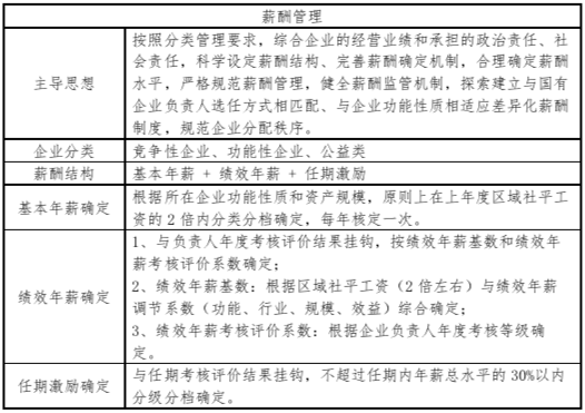 1、《中央管理企业负责人薪酬制度改革方案》(中共中央政治局2014年8月29日通过)主要强调三个方面:一是科学设置考核指标,完善薪酬综合考核评价办法。根据企业所处行业、承担职能、主营业务划分成功能类、公益类、竞争类三类企业,科学设置考核指标。二是明确薪酬构成,提高国有企业经营绩效。国企负责人薪酬由基本年薪、绩效年薪和任期激励收入三部分构成,绩效年薪和任期激励收入均与年度经营目标责任制考核得分挂钩。三是明确履职待遇及业务支出管理范围,规范支出管理。分别对用车、办公用房、培训、业务招待费、差旅费、通信费等支出范围进明确。