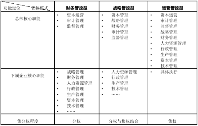 明确企业的战略后,依据业务发展定位选在合适的管控模式,通常来说集团对下属单位的管控模式依据集权程度分为财务管控型、战略管控型和运行管控型三种模式。而在实际操作中,根据业务发展的不同特点,又衍生出战略财务型管控和战略运行型管控两种模式。