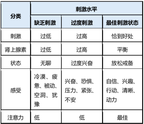 唤醒水平是指一个人心理和生理上的觉醒状态,可以简单理解为感知觉、注意、情绪、意志综合的心理水平的激活程度。也许很多人期望那种“懒洋洋的自由”或完全的“无忧无虑”,但是真正的“懒洋洋的自由”或“无忧无虑”降临的时候,他会发现这不是他最愉悦的状态。有研究发现,人偏好最佳唤醒水平,而每个人又有自己的最佳唤醒水平,高于这个水平时就需要减少刺激量,低于这个水平时就需要增加刺激量。刺激水平与偏好的唤醒水平之间的关系同样也是倒“U”形曲线。这也解释了为什么特别忙的时候希望闲下来,而特别闲的时候又容易“闲得慌”。