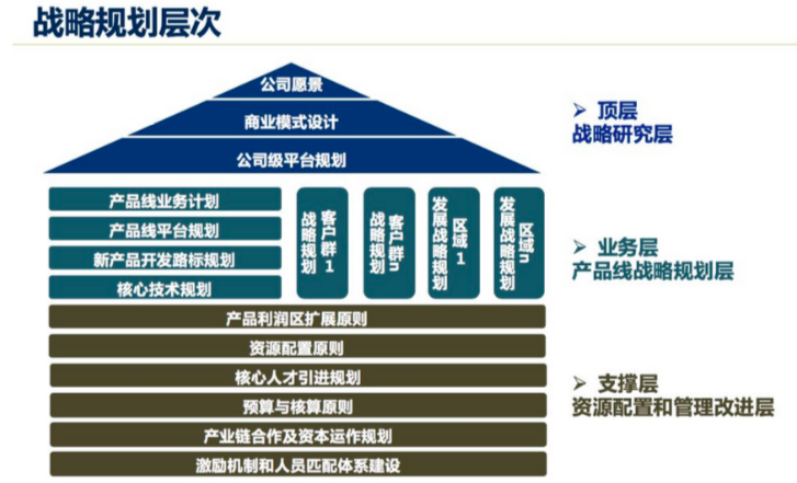 公司的战略规划分为三个层次:战略研究层(顶层)、产品线战略规划层(业务层)以及资源配置和管理改进层(支撑层),三个层次相互嵌套,互为输入,共同构成完整的战略,如图所示: