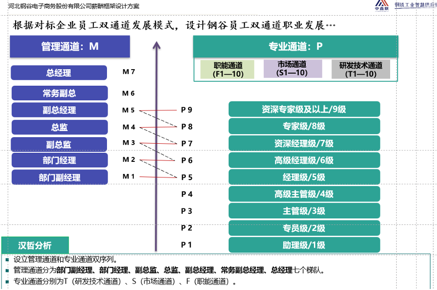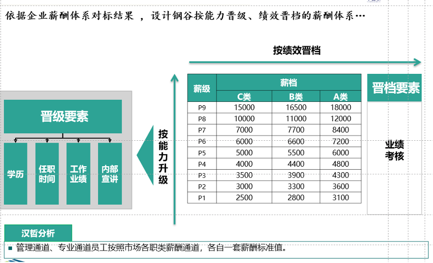 1、对标典型互联网企业薪酬模式及薪酬结构。研究分析阿里、腾讯、百度、华为四家公司的薪酬模式及薪酬结构,结合公司实际情况,对员工能力进行评估,按照能力晋级,绩效进档的方式设计能力薪酬体系,构建钢谷公司自己特点的薪酬体系。