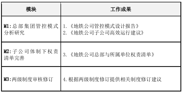 由于分改子之后,地铁公司总部与所属单位在公司治理结构、管控模式与定位等方面进行了调整,由此带来总部与所属单位在职责分工、权责划分等方面也需要进行同步调整,以便进一步明确总部与所属单位的权责界面,在此情形下,公司决定聘请外部机构协助梳理总部与子公司的职责分工与权责边界,促进分改子体制改革扎实有效的落地。