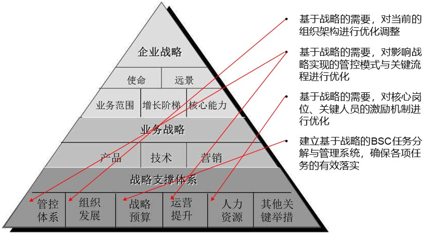 同时,又要全面理顺企业战略、业务战略与战略支撑体系的关系,对其中的关键体系进行 战略性优化与调整: