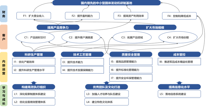 研究所制定《十四五发展规划》,明确发展目标和重点方向,保障战略目标的有效执行是重点,根据研究所的总体战略目标,借助平衡计分卡,从财务、客户、内部运营、学习与成长四个方面对战略目标进行逐层分解,形成若干战略主题,通过各部门梳理和讨论,最终确定研究所战略地图。