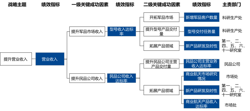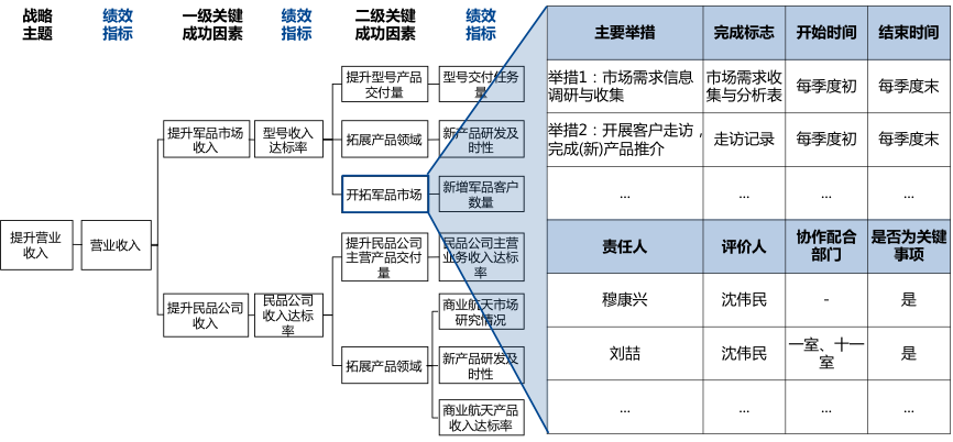 通过战略解码会将战略主题层层分解,形成能够促进战略目标实现的、可落地的关键成功因素,并对应绩效指标,确定主责部门。