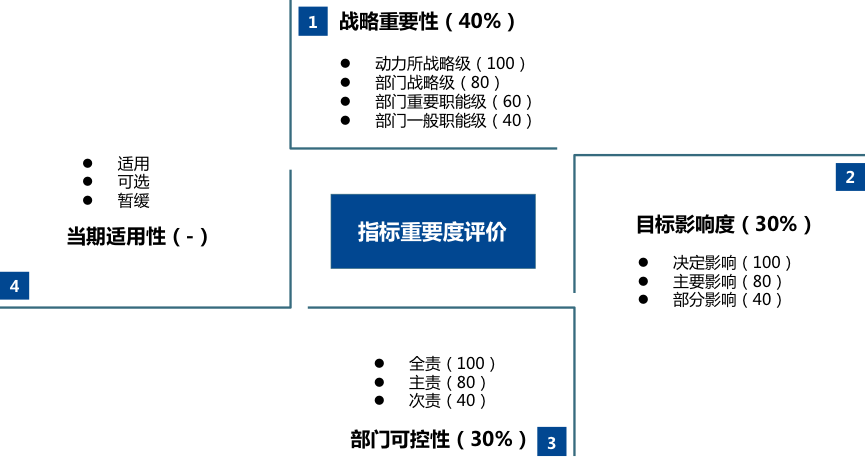 部门关键业绩指标和重点工作任务指标应反映部门主要的工作业绩和职责履行情况,原则上以8项左右为宜,最多不超过12项。通过指标关系图和指标评价模型对指标库中各部门的考核指标进行筛选,选取当期纳入考核的核心指标。