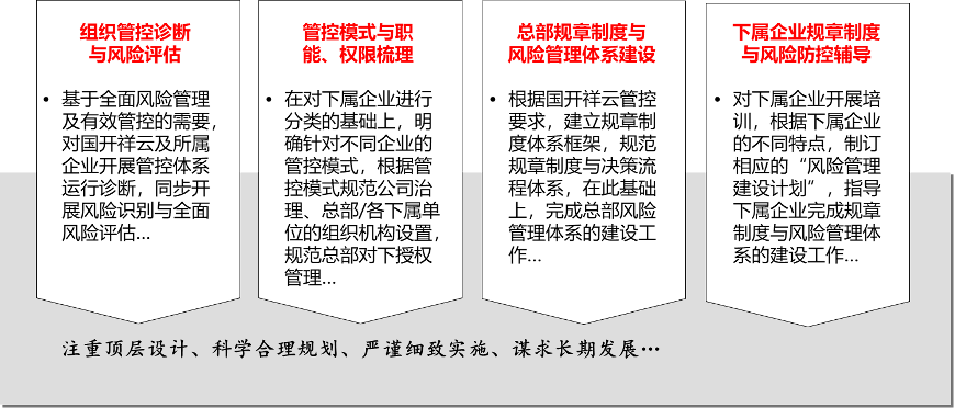 最后,在总部管控模式、制度体系、风险管理体系建设完善的基础上,对下属企业开展培训,辅导下属企业完成相应的制度建设与风险管理体系建设工作。