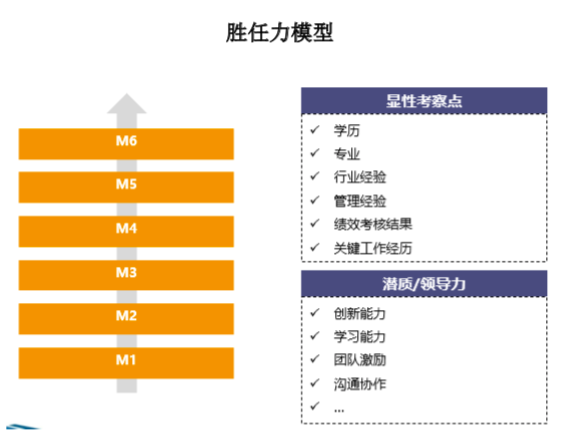 以冰山模型为理论基础,胜任力模型的构建不仅要考虑“显性”因素如:学历、专业、行业经验、绩效表现等;也要考虑“隐性”因素如:潜力、内驱力等,如下图:胜任力模型。而“隐性”因素在日常应用中往往通过构建符合企业导向的领导力模型的方式来完善胜任力标准,为后续管理人员选拔和晋升提供参考标准。