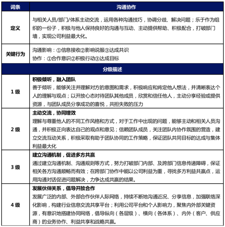 通过以上方法提取出企业的领导力词条后,还需进行领导力词条的释义和分级描述,以构建完善的领导力模型,也为后续领导力的评价提供层级标准。常见的能力词条释义及分级描述标准如下: