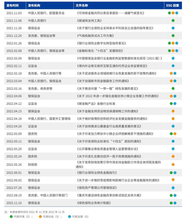 虽然ESG这一概念在2007年才被正式提出来,但是进入21世纪以来,我国陆续出台了一系列相关政策法规来规范和引导ESG活动。 最早可追溯到2002年初,中国证监会、原国家经济贸易委员会联合发布了《上市公司治理准则》,阐明了我国上市公司治理的基本原则,自此至2022年底,我国一共出台了84部政策法规。仅2021年11月至2022年11月一年内的ESG相关政策文件就有22个(如下图)。