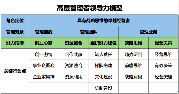 根据冰山模型(图1),冰山以上的部分包括基本知识、经验与技能,如学历背景、专业知识、操作技能等,冰山以下的部分包括个人特质、动机,如主动性、人际理解能力、客户意识、成就动机等。通过高绩效员工的能力素质模型、人才测评结果来进行关键能力画像,再结合测评数据结果,进行高绩效员工的能力项目或能力排序。如果企业没有建立能力素质模型,可以采用卡片建模、头脑风暴或团队共创方式,提炼出大家对该岗位都认同的高绩效能力项目,如选出前5位的能力项目来建立能力素质模型(图2)。如高层管理者需要具备创业心态、资源整合、组织能力建设、战略思维、经营决策等关键能力,并通过不同的关键行为点及行为等级评价标准来鉴别所属能力项的高绩效行为。