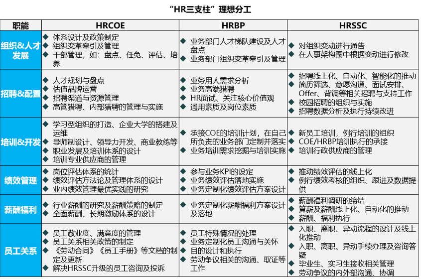 因此,诞生了人力资源管理的三支柱模式,把原来的按照职能划分的方式换成了“高中基”的不同专业化程度的切分,也就是HR三支柱的COE(高级职能,政策中心,工作内容主要是制定人力资源战略、政策、流程、体系、方案等,像专家、顾问);HRBP(中级职能,紧贴业务、执行政策,是更基于业务导向的人力资源解决方案提供和执行者);SSC(基础职能,支持服务,工作内容主要是日常操作事务类工作,是标准化的服务提供者)。简单来说,三支柱是基于HR六大模块,并将每个模块以制定战略——执行——基础事务的纵向工作方式进行划分。