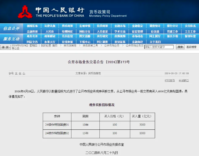 8月29日,中国人民银行以数量招标方式进行了公开市场业务现券买断交易,从公开市场业务一级交易商买入4000亿元特别国债。其中,10年期24续作特别国债01买入量3000亿元,15年期24续作特别国债02买入量1000亿元。