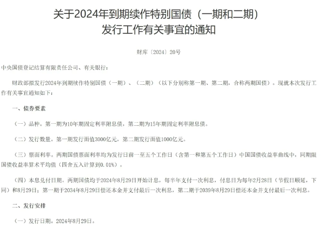 8月19日,财政部发布关于2024年到期续作特别国债发行工作有关事宜的通知。财政部拟发行2024年到期续作特别国债(一期)、(二期)。第一期为10年期固定利率附息债,第二期为15年期固定利率附息债。第一期发行面值3000亿元,第二期发行面值1000亿元。两期国债票面利率均为发行日前一至五个工作日(含第一和第五个工作日)中国国债收益率曲线中,同期限国债收益率算术平均值(四舍五入计算到0.01%)。发行日期为2024年8月29日,在全国银行间债券市场面向境内有关银行定向发行,中国人民银行将面向有关银行开展公开市场操作。