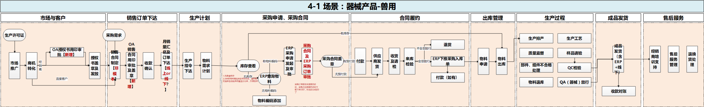 3.通过梳理业务流和审批流,为已上线流程的审批节点、审批权限提出优化建议:如(1)此前涉及法务的审批通常都是法务在业务部门前;(2)当前采用的为金蝶的ERP系统,适合项目制的业务,缺少生产环节,导致销售的订单仍然与研发项目绑定,缺少生产制造型的项目编号;(3)当前的ERP仅能监测到研发阶段的物料信息,监测不到生产阶段的原材料、辅料、半成品、产成品信息,需要优化供应链的物料分类、物料编码,并打通两个阶段的物料信息共享。