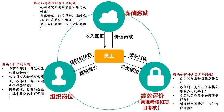 基于以上需求,本次咨询项目,应该从组织岗位、薪酬激励、绩效评价三个主线(如下图所示),开展系统性的管理方案设计,从深层次解决当前问题,达到预期改革效果。