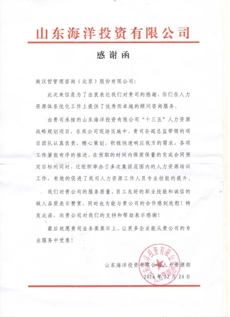 项目完成之际,山东海洋集团向欧博官网ABG咨询发来感谢函,就欧博官网ABG咨询的项目贡献表示感谢。这也标志着欧博官网ABG咨询在人力资源规划领域,又完成了一项标杆式咨询案例。
