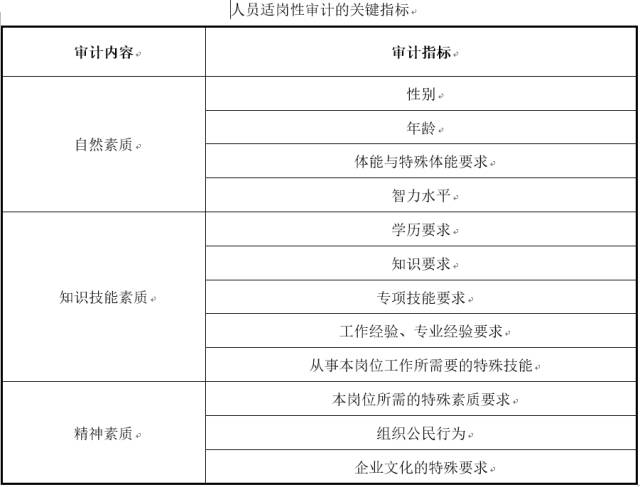 对于人员适岗性的评价的基础,是岗位任职资格标准。所谓任职资格标准,是胜任本岗位工作所需要的知识、经验、技能与素质,也可以归纳为自然素质、知识技能素质与精神素质三个维度,其审计的关键指标如下表所示: