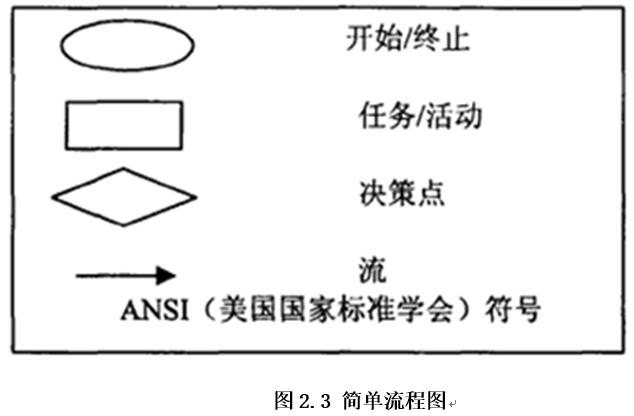 该标准以美国国家标准学会的标准为基准,是企业最为常用的流程图绘制标准,其描述形式如图2.3所示: