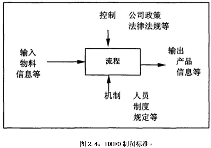 该标准是BPR流程图常用的标准。这个标准是美国国防部在70年代制定的。IDEFO是国际定义(International DEFination)的缩写。虽然这个标准开始时是作为软件开发工具制定的,但现在已经被各类制造业和服务业组织广泛地作为一般流程图工具使用,其描述形式如图2.4所示: