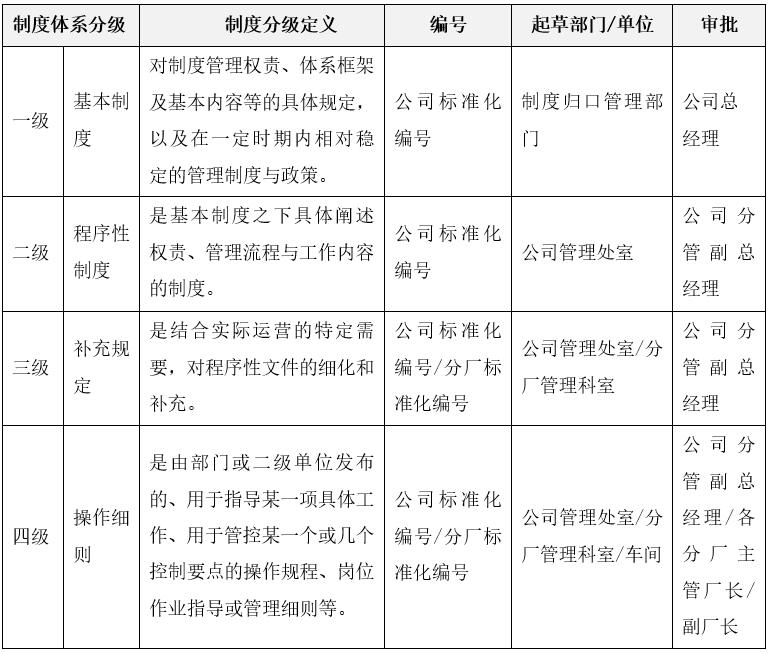 单体企业制度框架的搭建,要清晰界定制度体系内涵,分析内外部环境对制度建设的影响,在此基础上,借鉴标杆企业的经验对制度进行分级设计,同时,基于企业主业务链条与支持、管理职能,进行制度的分类设计,从而形成“纵向到底,横向到边”的制度体系框架,作为今后制度体系建设的基础。