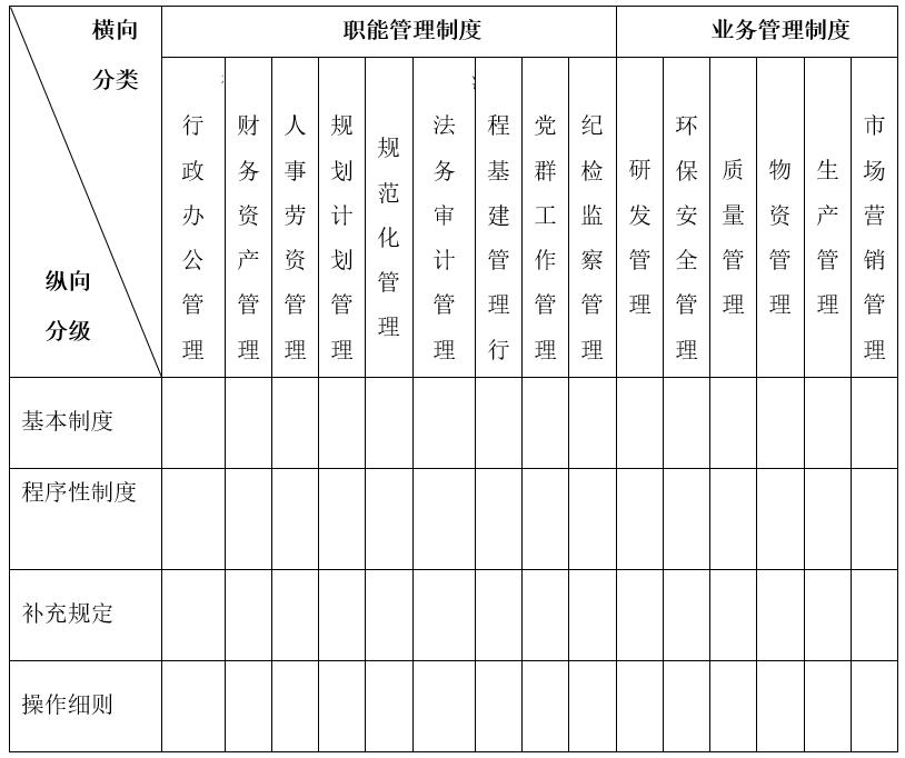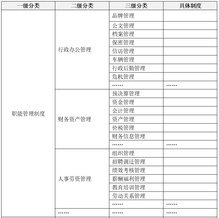 根据企业的管理职能,可以确定职能管理制度的分类,一般来讲,企业的核心职能包括战略管理、计划管理、风险管理、资产运营、财务管理、审计监察、内部控制、人力资源管理、信息资源管理、公共关系管理、基本建设管理、党群工作、精神文明建设和企业文化建设,等等。当然,每个企业的职能不尽相同,这就需要根据职能的关键性、职能相关制度的数量等因素确定制度模块的数量和名称,力求做到无交叉、无遗漏、无重复,使之涵盖管理职能的方方面面。