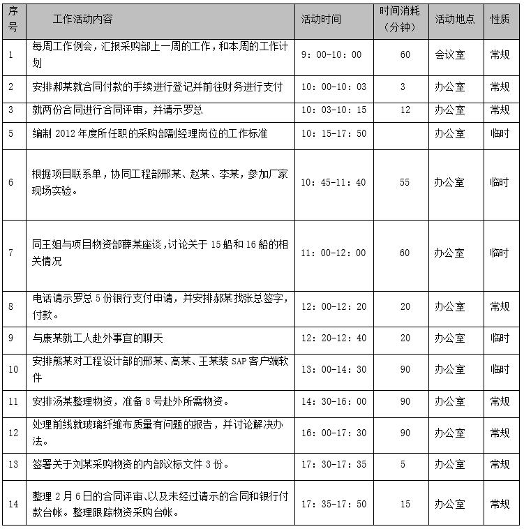 对于工作量不容易界定的工作,可以采用“工作日志”法核定岗位工时。所谓“工作日志法”,是指按时间顺序详细记录任职者在一段时间内的工作内容与工作过程,经过归纳、分析,达到对岗位的工作内容、工作时间全面了解的一种方法。采用工作日志法定编时,研究人员或者岗位上的任职者需要对岗位上的人员现场进行实地观察、记录,填写“工作日志”。根据工作日志记录,可以计算出每个岗位的有效工作时间,从而确定岗位编制情况,一般的标准是,岗位上每天的工作时间在13.6个小时以上者,建议岗位再增加1位专职人员,当岗位的有效工作时间在9.7-13.6小时的时候,建议1人专职,另一人兼职;当岗位有效工作时间在5.6-9.6小时时,建议该岗位定编1人;当岗位的有效工作时间小于5.6人时,建议该岗位由其他人员兼职。