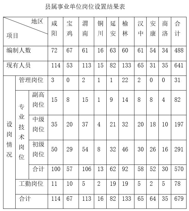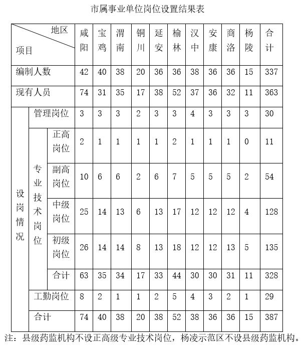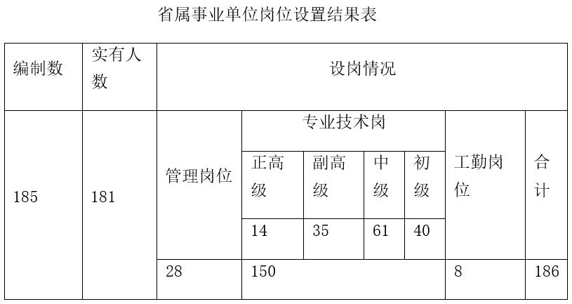 药监系统的事业单位岗位设置工作,历时半年,全部完成岗位设置和审批工作,主要结果如下:96个事业单位中,除省属信息培训中心外,全部确认为以专业技术人员为主体,管理岗位和工勤技能岗位为辅。全系统共设岗1252个,其中管理岗位89个,专业技术岗位1048个,工勤技能岗位115个。省、市、县三级药监机构各类岗位具体分布情况见下表: