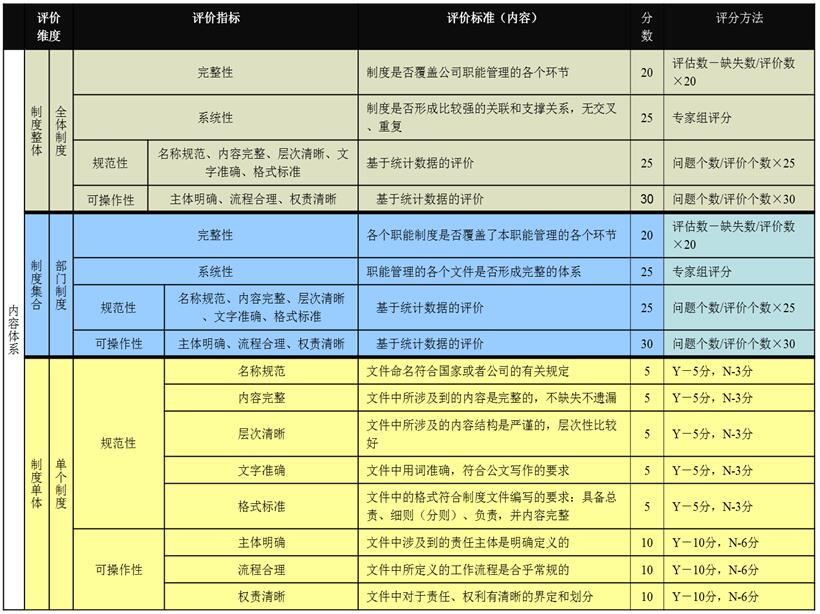 根据《制度内容评估模型》,通常应分别对制度整体(全体制度)、制度集合(部门制度)和制度单体(单体制度)三个层面进行评价,每个层面均从制度的完整性、系统性、规范性和可操作性四个指标进行评价,依据对应的评估标准(内容)和评分方法进行打分,每个层面满分100分,指标的权重由该指标在本层面制度管理中的重要性决定,指标的得分,由专家打分及针对制度的评审、分析和统计确定。