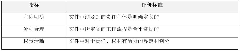 本方向的评估重点包括:制度内容是否有针对性,是否有较强的可执行性,在解决问题的具体规定和措施上是否全面,对实际工作是否有指导意义;制度中涉及的定义和范围等,用词是否过于宽泛,是否存在歧义,等等。