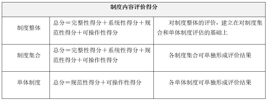 (1)在分别对单体制度、制度集合、制度整体的内容进行评分的基础上,可以得到一个组织的制度内容的整体评价结果。